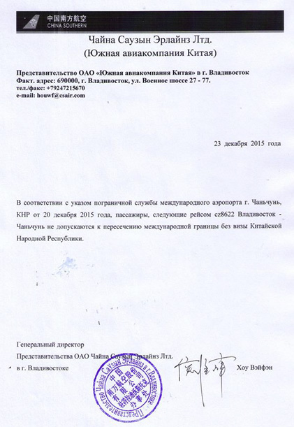 Данные изменения произошли в связи с указом пограничной службы аэропорта Чаньчунь (КНР) от 20 декабря 2015 года.