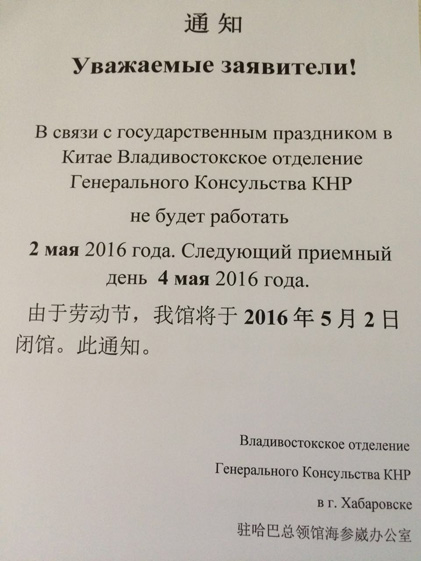 В связи с государственным праздником в Китае Владивостокское отделение Генерального Консульства КНР не будет работать 2 мая 2016 года.