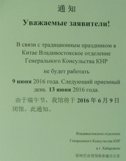 В связи с традиционным праздником в Китае Владивостокское отделение Генерального Консульства КНР не будет работать 9 июня 2016 года.